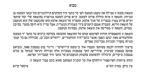 Vol 1 Seder Zera'im. Second edition. 2024. DIN A 4 Format. 440 pages. Vol 2 Seder Mo'ed. 2025. DIN A 4 Format. 628 pages. 638 pages. Vol 3 Seder Nashim. 2024. DIN A 4 Format. 446 pages. Vol 5 SederKodashim. Second edition. 2024. DIN A 4 Format. 462 pages. Vol 6 Seder Toharot. Second edition. 2024. DIN A 4 Format. 552 pages.