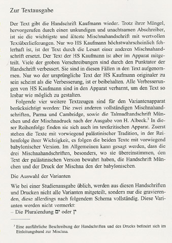 Da beide Ausgaben verschiedener Natur sind, wurde die Jerusalemer Mischna mit Absprache des Suhrkamp Verlages fortgesetzt. Wer also am Hebräischen und am Variantenapparat und größerem wissenschaftlichen Apparat interessiert ist, sollte auf die Jerusalemer Mischna zurückgreifen.